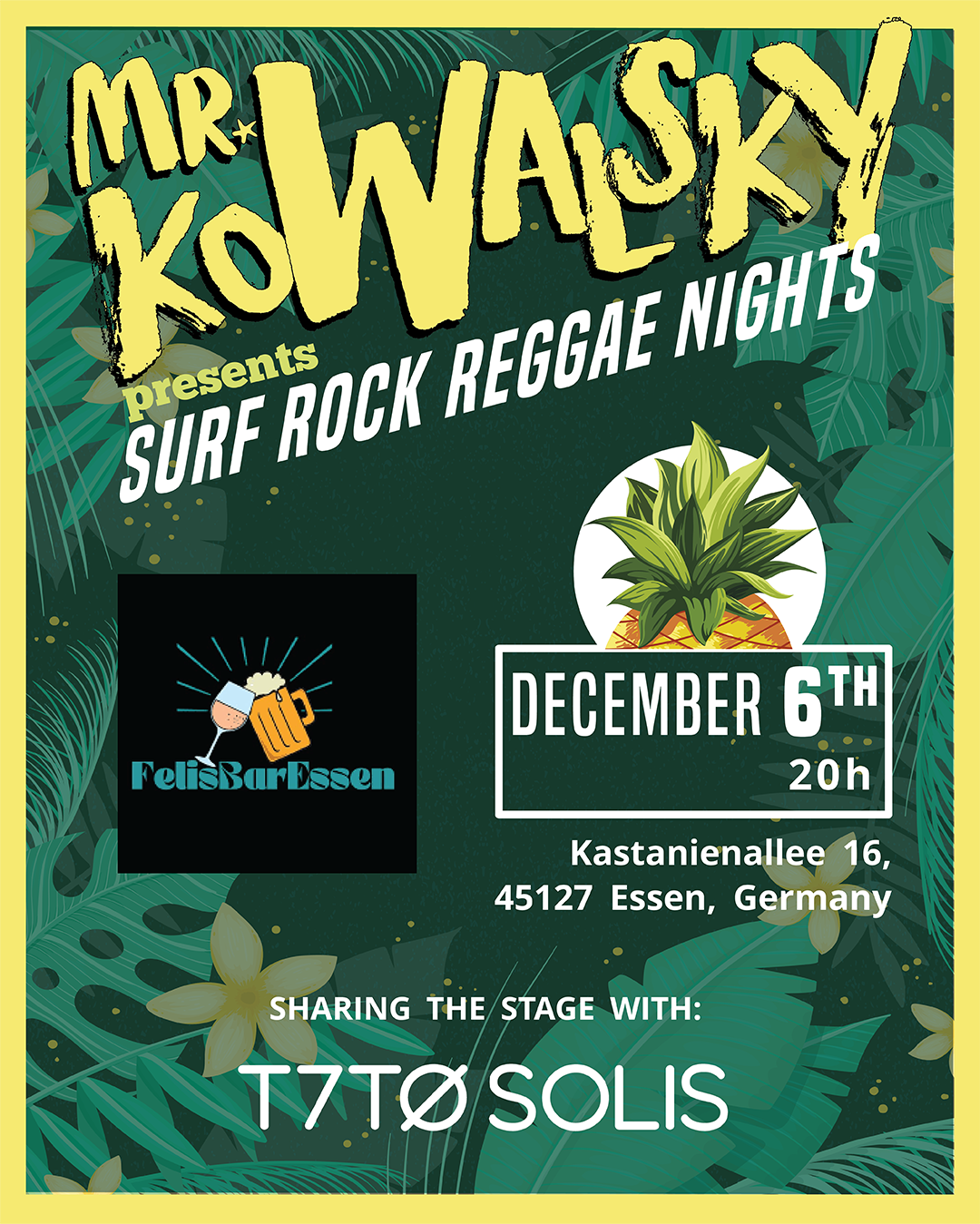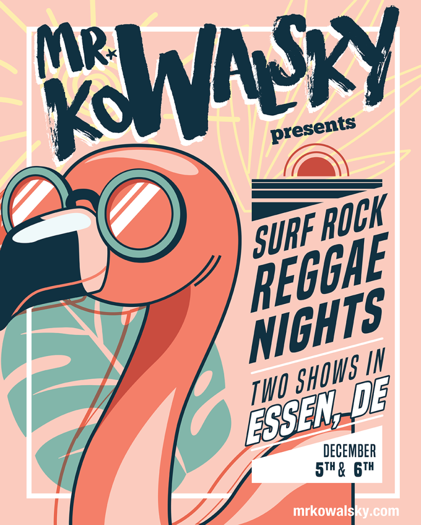 Mr.Kowalsky Presents: Surf Rock Reggae Nights 06 Dec 2025 Essen, GER Details Time : 20h Venue : Felis Bar Address : Kastanienallee 16, Zip : 45127