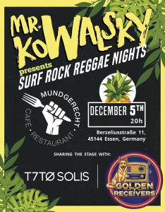 Mr.Kowalsky Presents: Surf Rock Reggae Nights 05 Dec 2025 Essen, GER Details Time : 20h Venue : Mundgerecht Cafe Address : Berzeliusstraße 11 Zip : 45144
